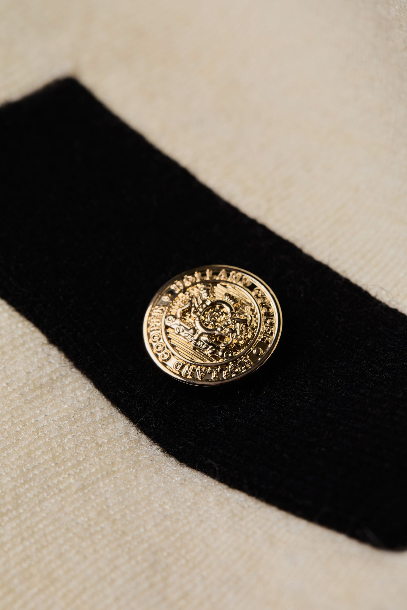 Featuring exquisite contrast detailing and a striking stripe at the hem and cuffs adds a touch of sophistication. The classic crew neck provides a clean and versatile silhouette, while the gold rivets introduce a subtle hint of glamour, making this cardigan a perfect choice for both casual and more elevated occasions.