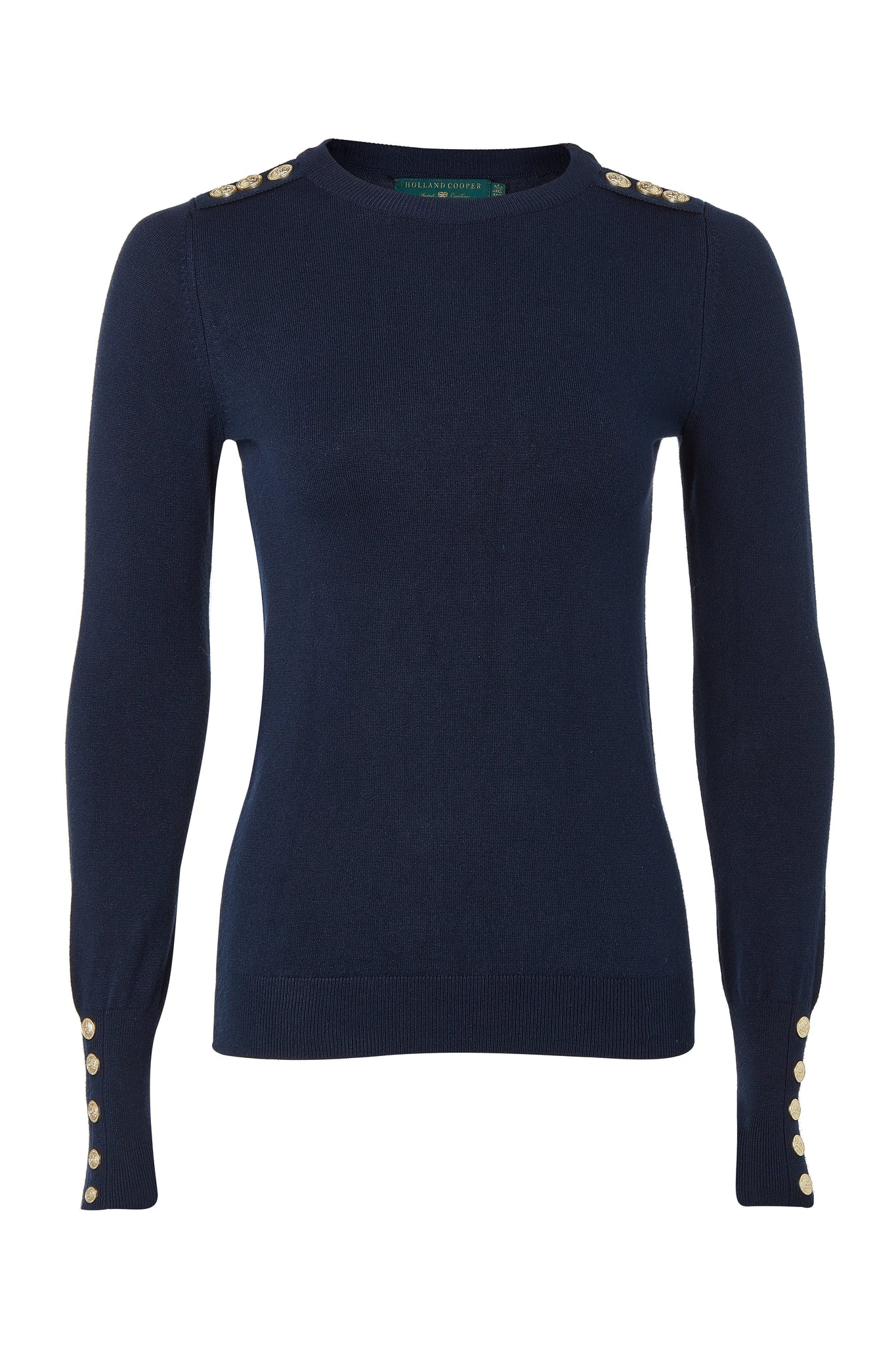 Introducing HC's update to the buttoned knit crew neck, now with our signature hardware on both shoulders, to form part of your signature look. Complete every outfit with this stylish, classic and easy to wear wardrobe staple.