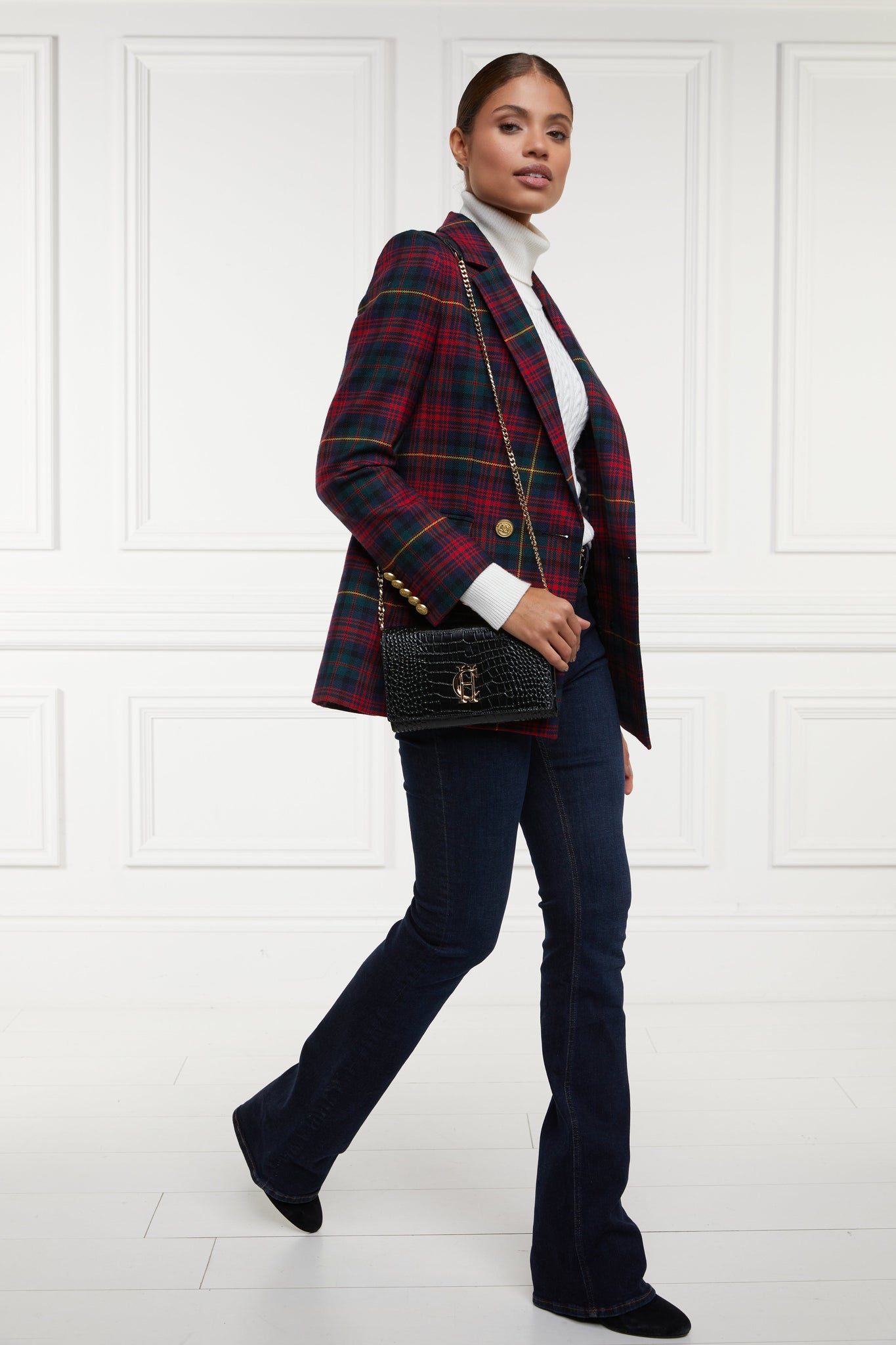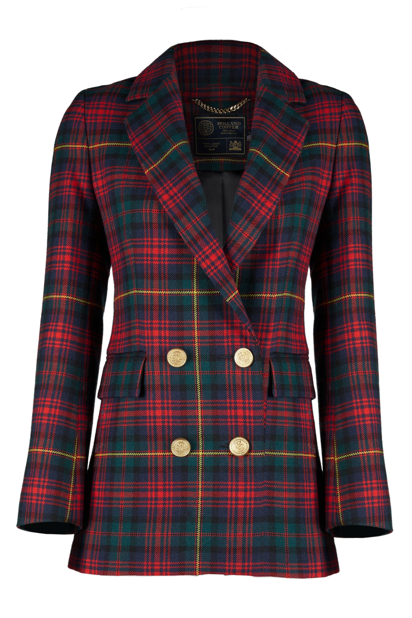This Double Breasted Blazer is handmade in the UK and designed with our signature HC gold hardware on the front and cuffs. The logan tartan blazer comes with a beautiful soft black fabric under the collar. This sharp silhouette will transition you through all the seasons!