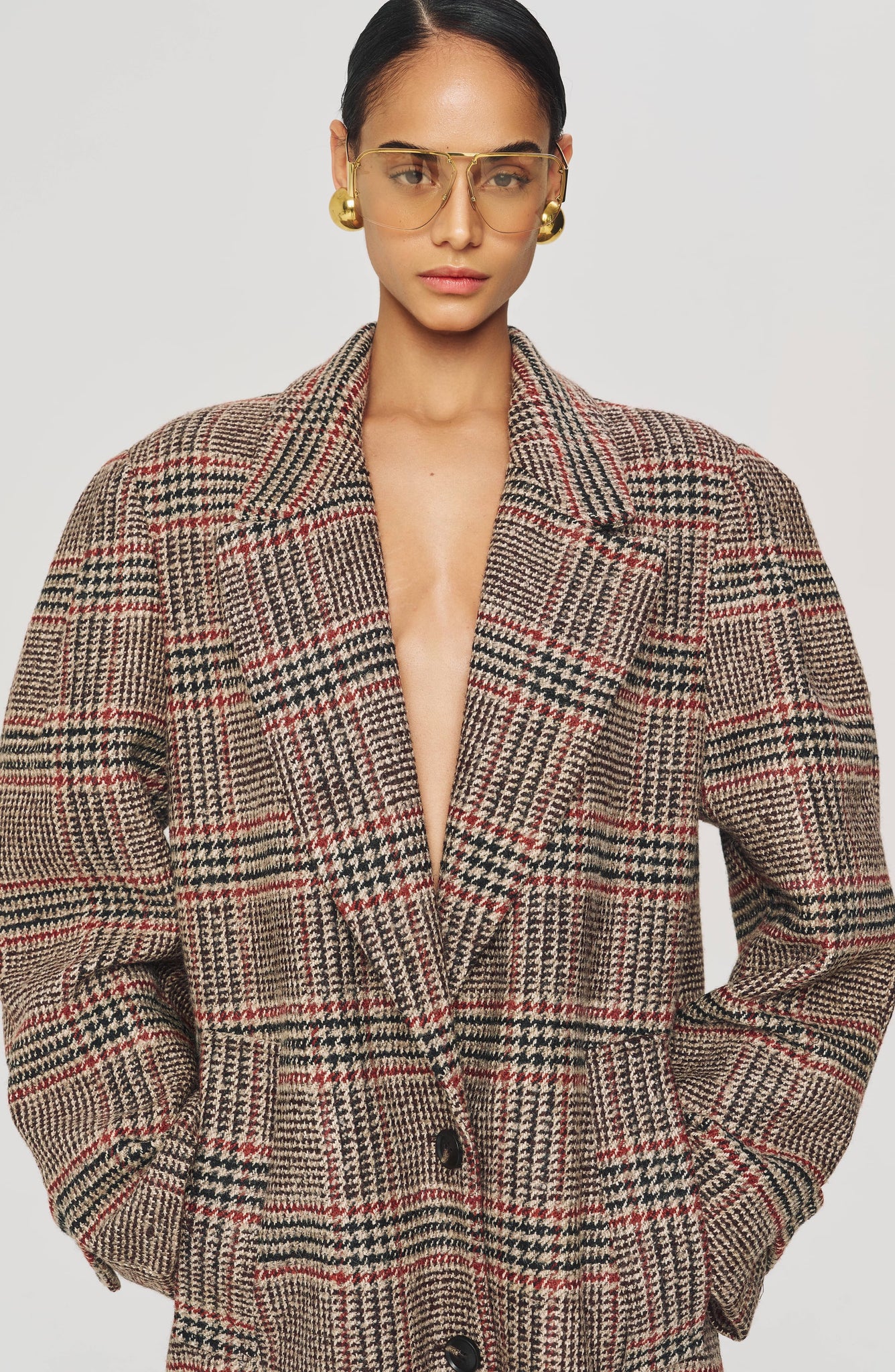 The Jenkins Coat delivers quiet luxury with a tailored edge. Rendered in a menswear-inspired plaid, its oversized shape is grounded by clean lines and strong shoulders. A timeless outerwear staple that elevates anything layered underneath.