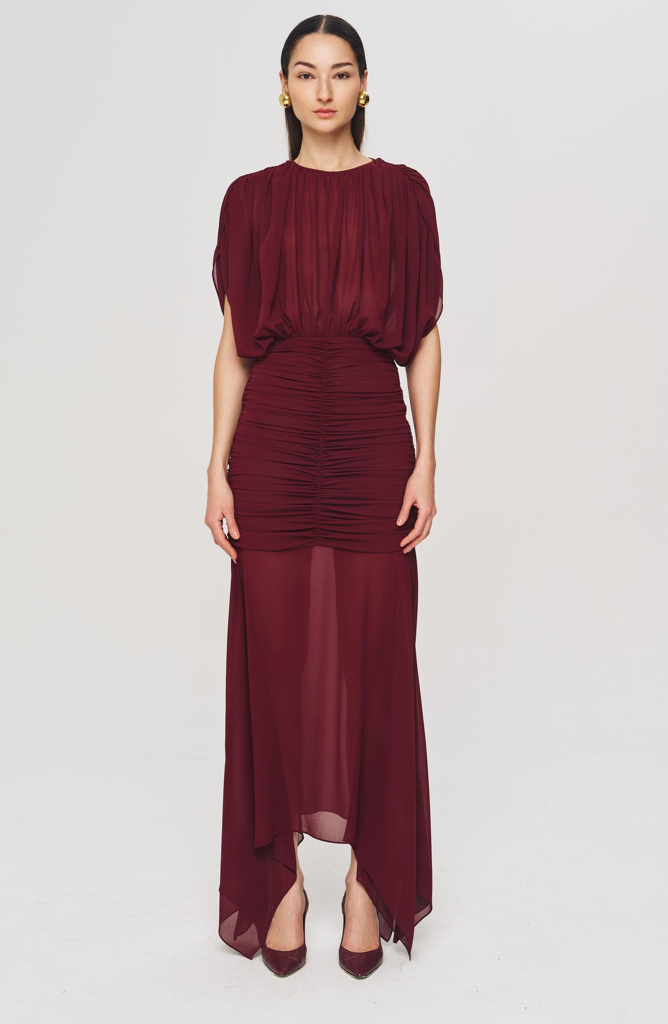 Ethereal yet grounded, the Louisa Dress blends fluid chiffon with body-hugging ruching. The billowed sleeve creates elegant contrast against the fitted waist and sheer hemline. Designed to float with every step—this one is made for movement.