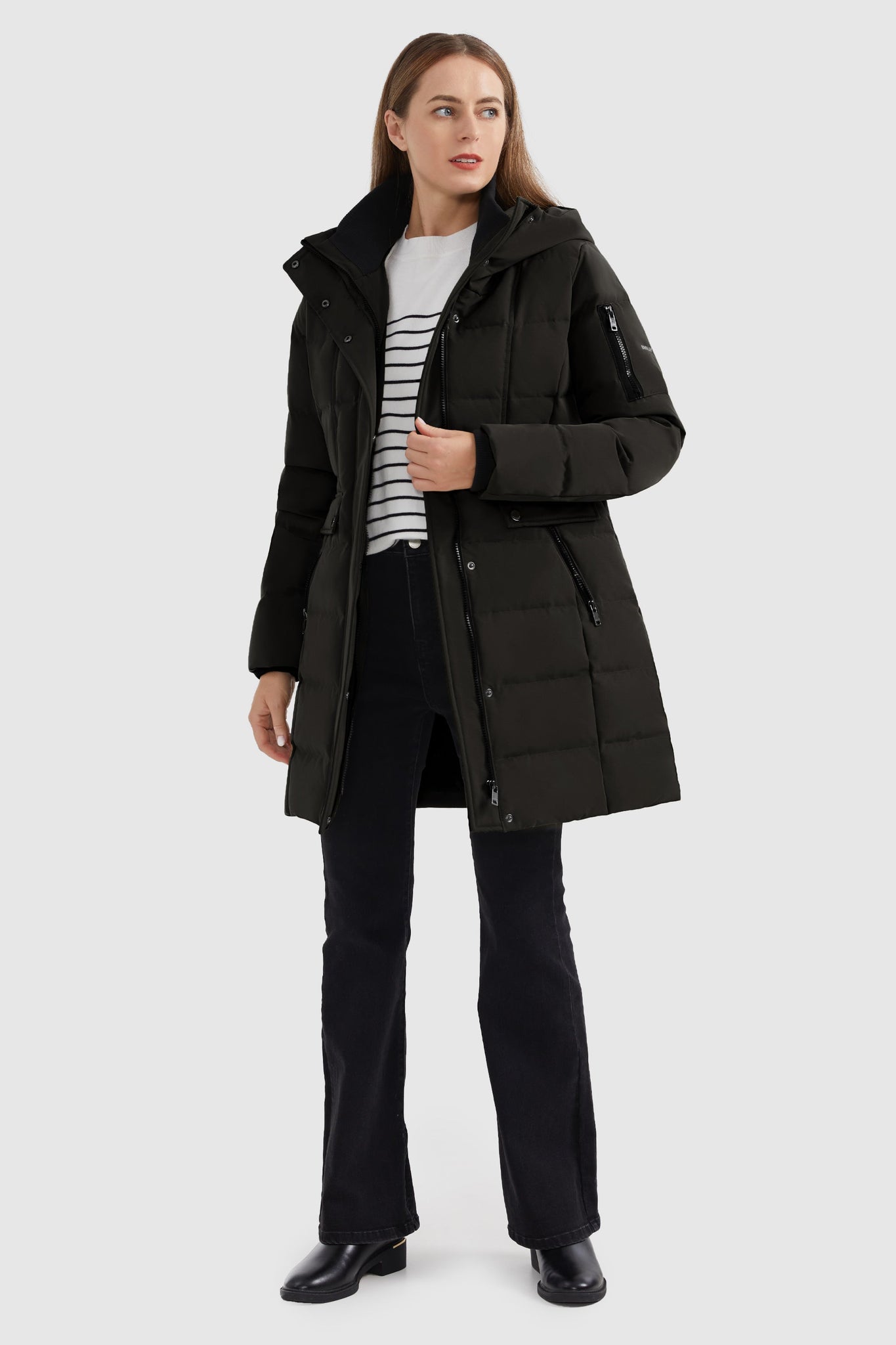 This puffer jacket has 2 side pockets with zippers on the front, 2 decorative pockets looking fashionable, and 1 inside pocket to put important items.1 pocket with zipper with label on the left sleeve, threaded cuffs, and collar keep warm and premier luxury. Ideal for women outside wearing in this winter season, its simple and hot design makes you look charming.