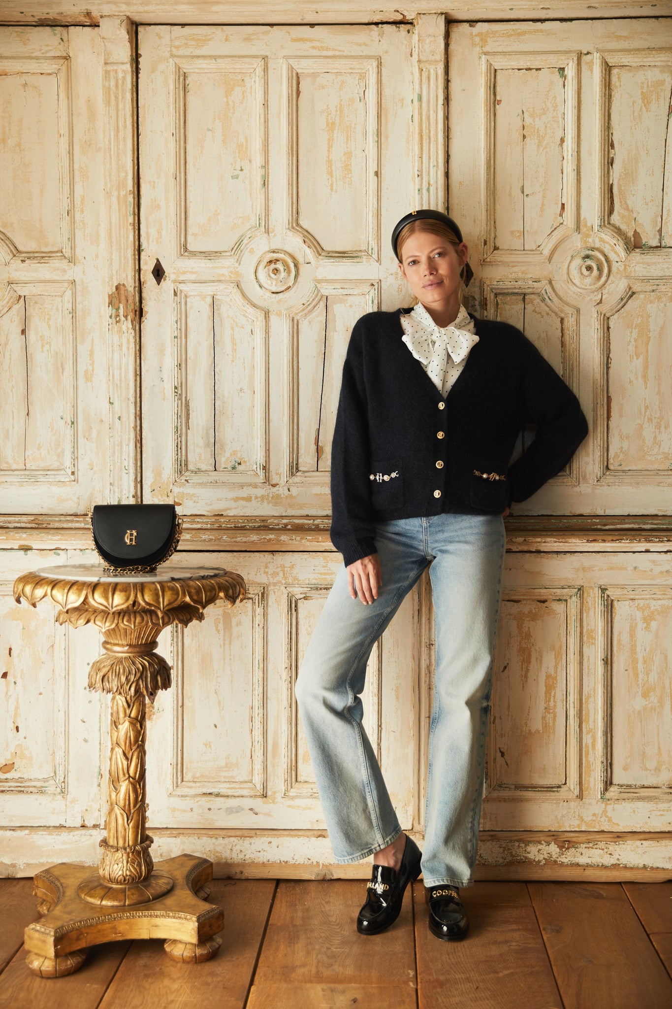 The Mila Cardigan is the perfect blend of comfort and sophistication, designed for a relaxed fit that drapes effortlessly over any outfit. This V-neck cardigan is crafted from a sumptuous mohair blend, providing a soft and cozy feel while maintaining a lightweight and breathable quality. The front is adorned with signature gold buttons that add a refined, elegant touch, while the HC pocket charms offer a subtle nod to timeless style.
