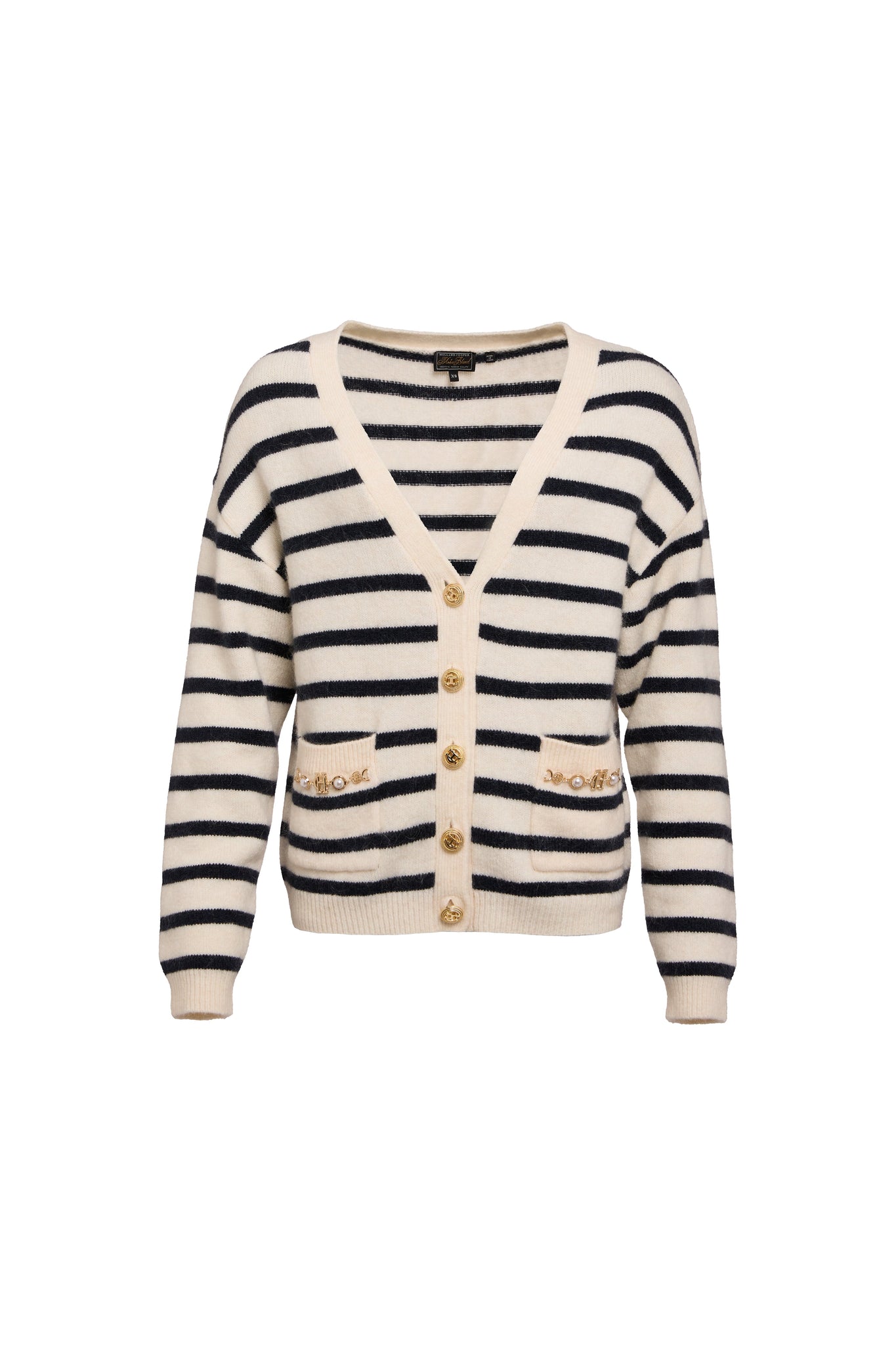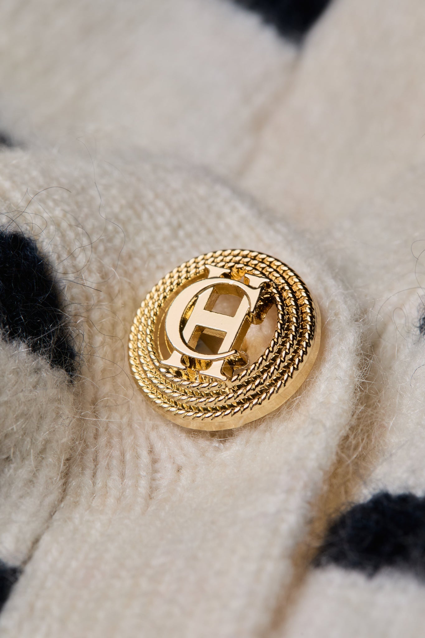 The Mila Cardigan is the perfect blend of comfort and sophistication, designed for a relaxed fit that drapes effortlessly over any outfit. This V-neck cardigan is crafted from a sumptuous mohair blend, providing a soft and cozy feel while maintaining a lightweight and breathable quality. The front is adorned with signature gold buttons that add a refined, elegant touch, while the HC pocket charms offer a subtle nod to timeless style.