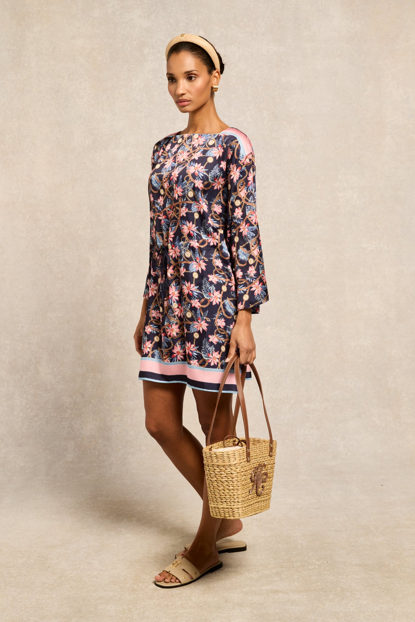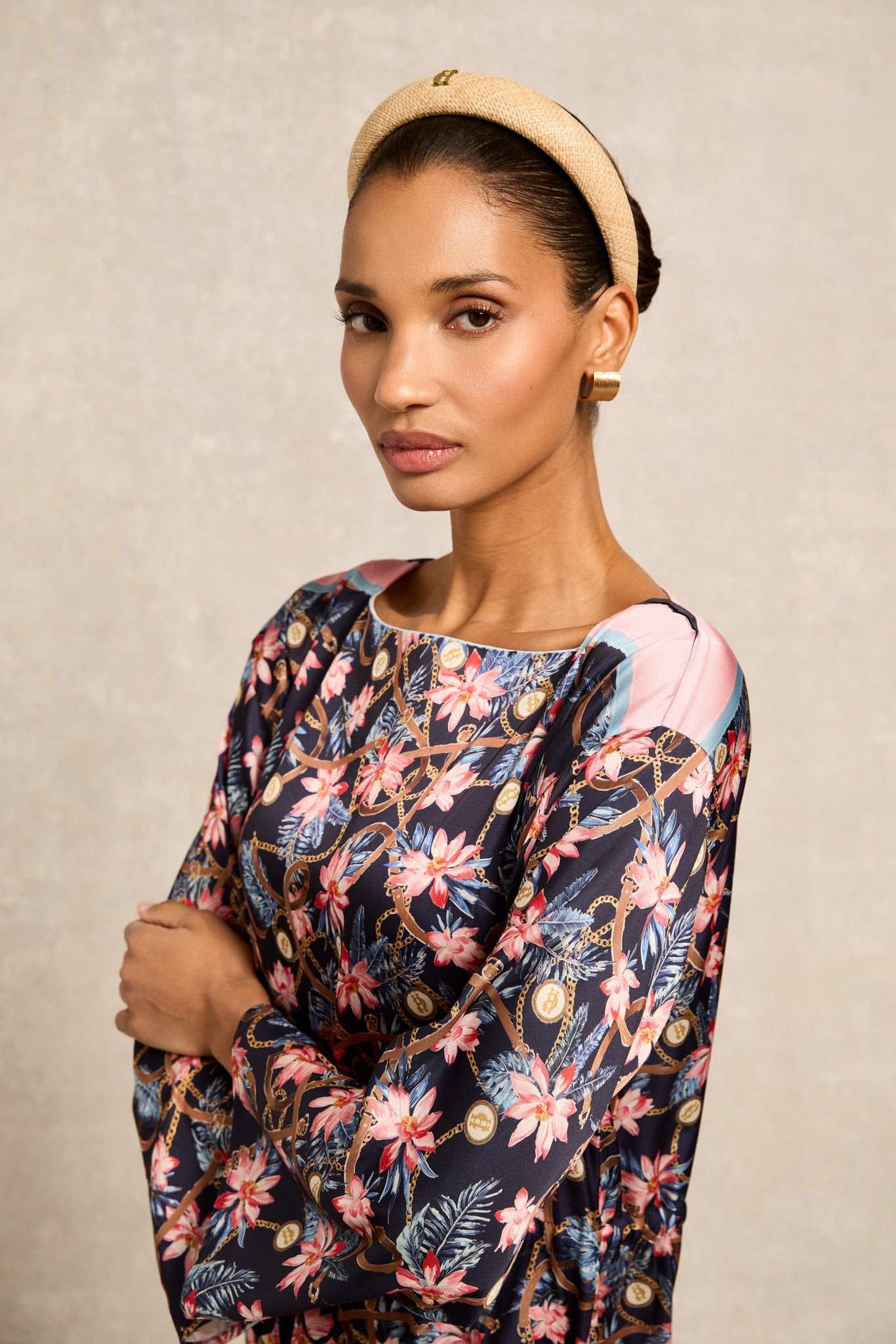 This refined and modern headband has been designed with a minimalist aesthetic. Crafted from a timeless Rattan fabric with a padded composition, the gold HC makes for a statement and iconic wear.