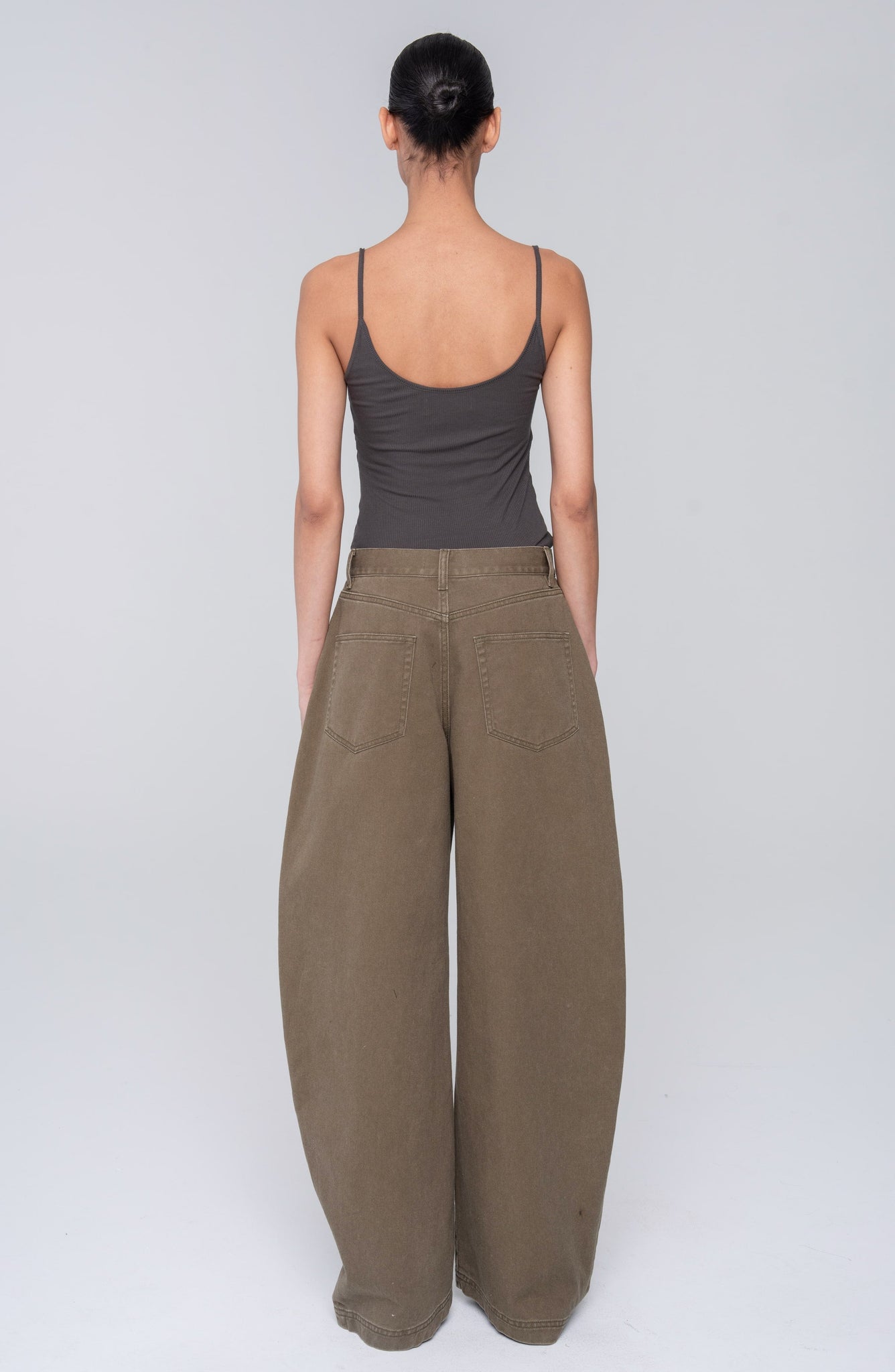 The Ninon Pants combine a high-rise waist with exaggerated wide legs, delivering volume and structure in equal measure. Made in an earthy olive hue, these pants strike a balance between utilitarian edge and off-duty ease.