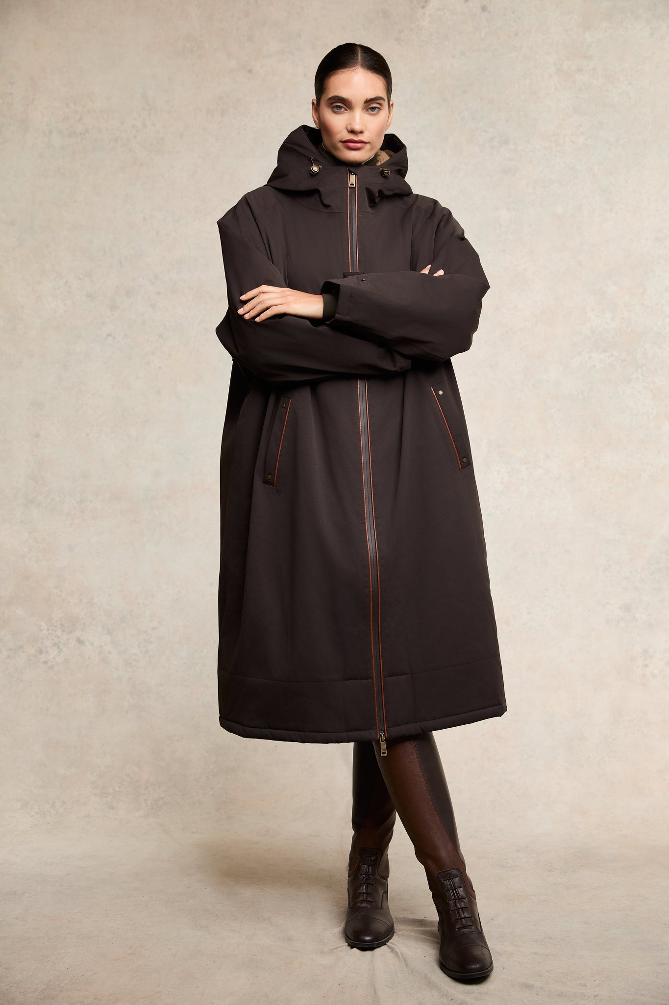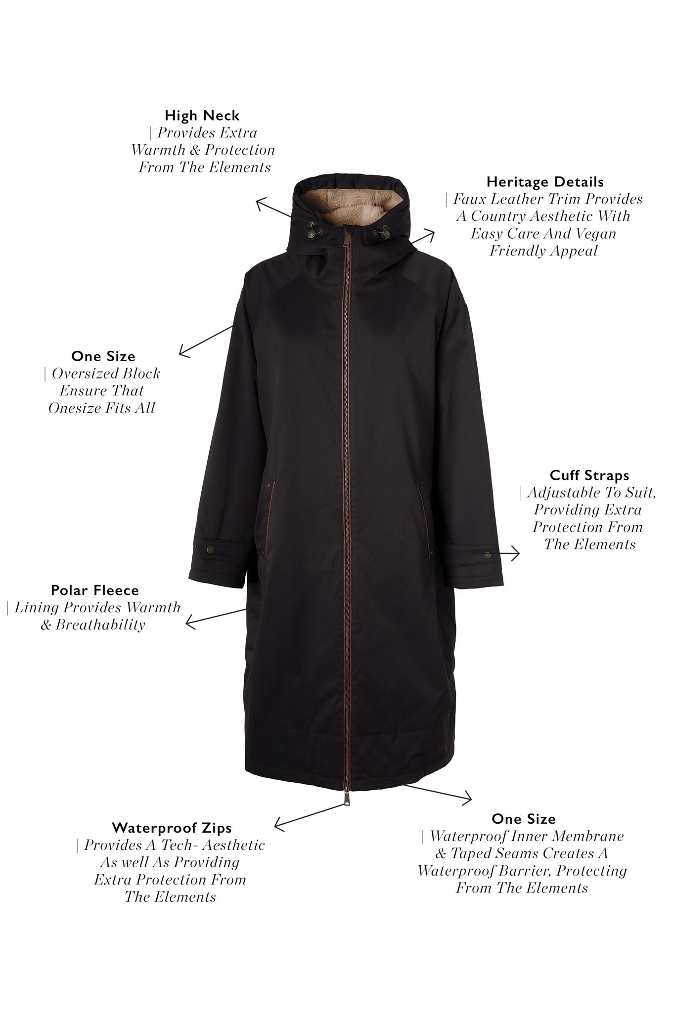 A must-have for the discerning adventurer, this super oversized coat boasts over-knee length for maximum coverage, ensuring you stay stylish and protected in any weather. Crafted with a waterproof outer shell fabric and fully taped waterproof seams, the full zip closure and cuff adjustment provides both functionality and versatility. With a borg lined hood with welt pockets to the front, the faux leather piping enhances this practical piece.