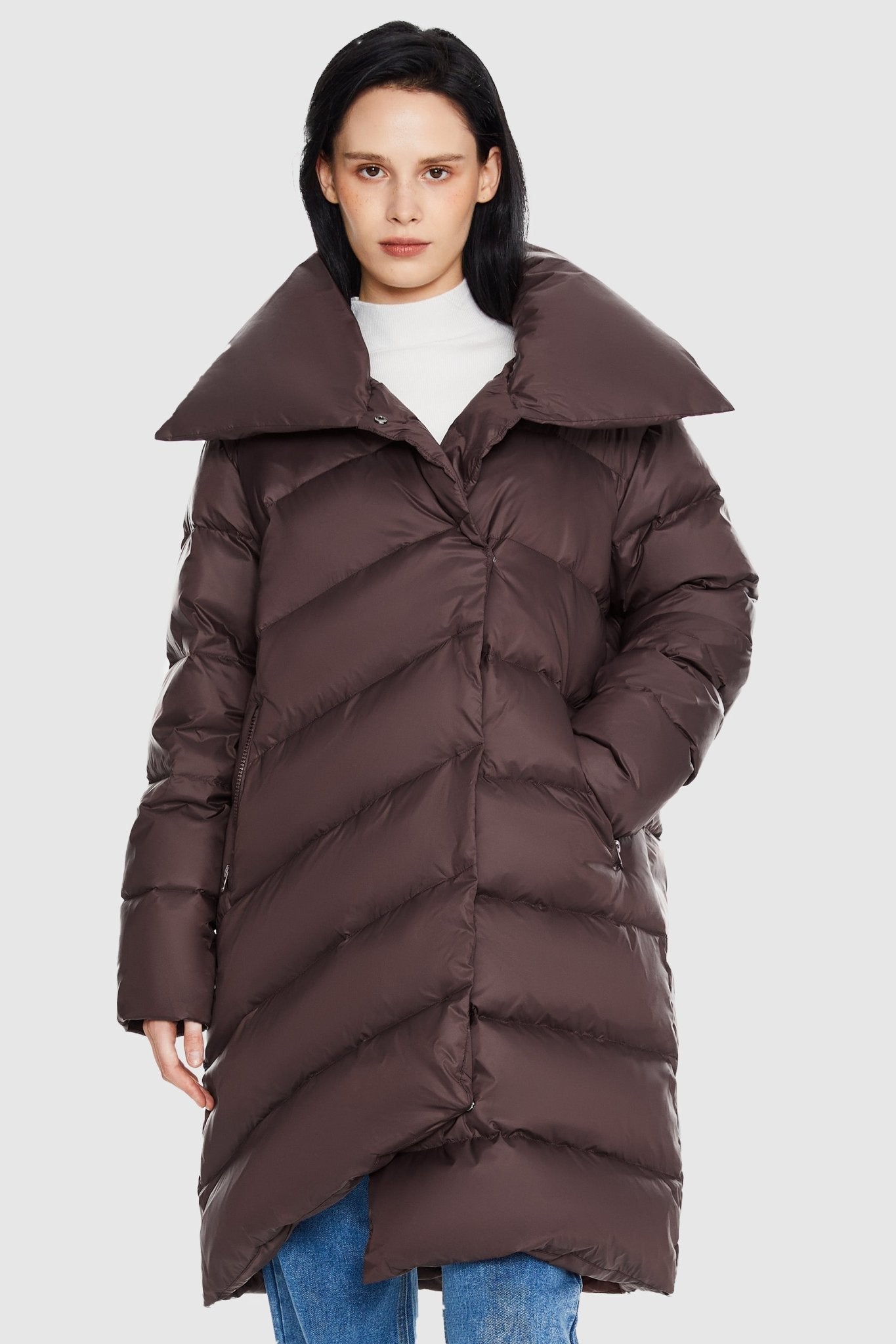 This winter coat for women showcases an oversized collar, elevating the overall design with a touch of extravagance. The exaggerated collar not only makes a fashion statement but also enhances warmth and protection, particularly during colder seasons. The puffer coat for women has an irregular hemline, which sets it apart from typical down coats. Its asymmetrical design includes a unique and trendy element, making it a noteworthy addition to any wardrobe. Ideal for different occasions. Wear it when running errands on a chilly day or pair it with jeans for a casual night out with friends.