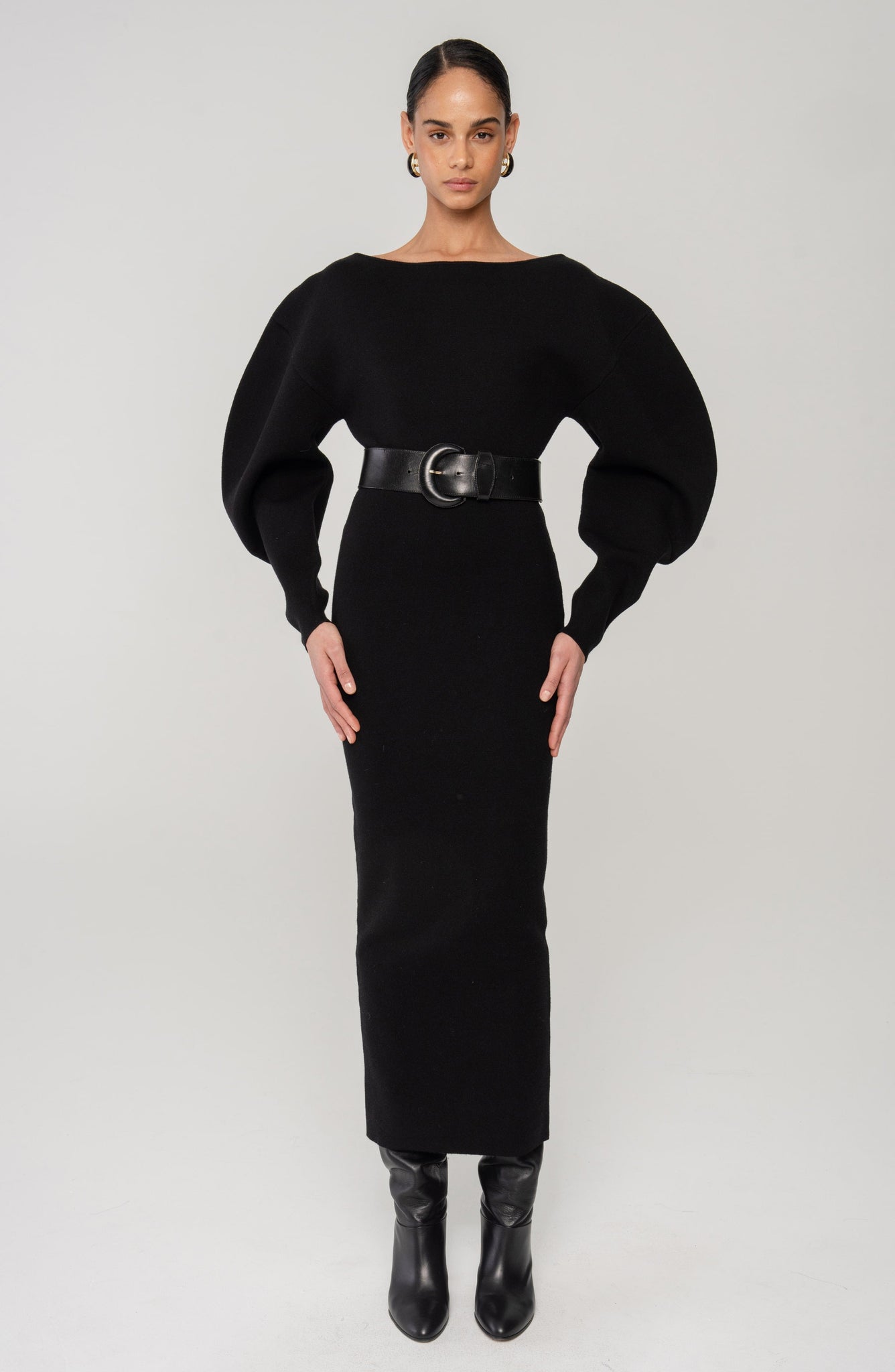 An essential with edge. The Randy Dress balances oversized, cocoon-like sleeves with a slim, midi-length silhouette. Knit in a rich black and finished with a wide belt, it’s made for cool-weather moments that demand shape and presence.