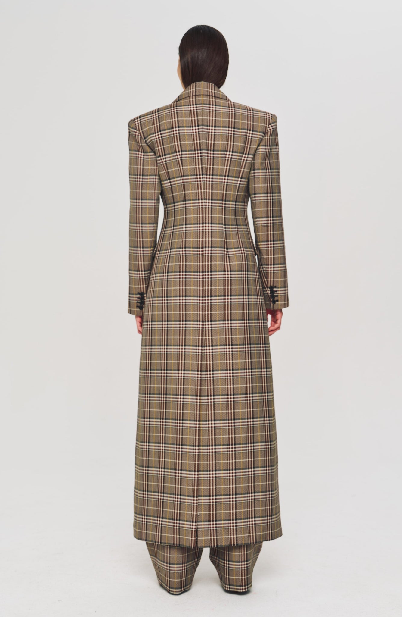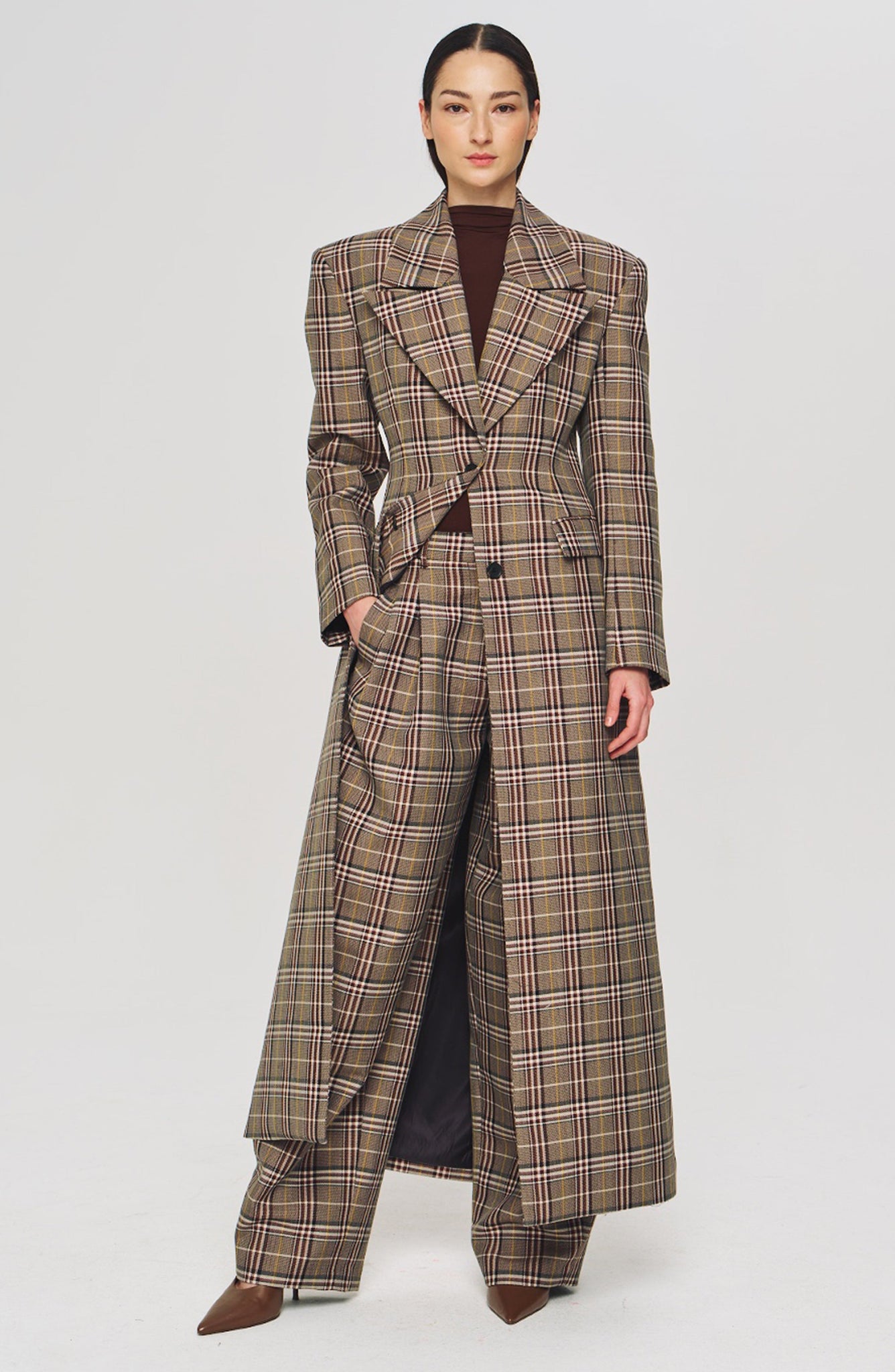 The Sandrine Coat is the ultimate outerwear statement. Designed in a brown jacquard, this longline silhouette features a strong shoulder, a cinched waist, and dramatic lapels. Fully lined and made to layer, it’s the coat that transforms every outfit.