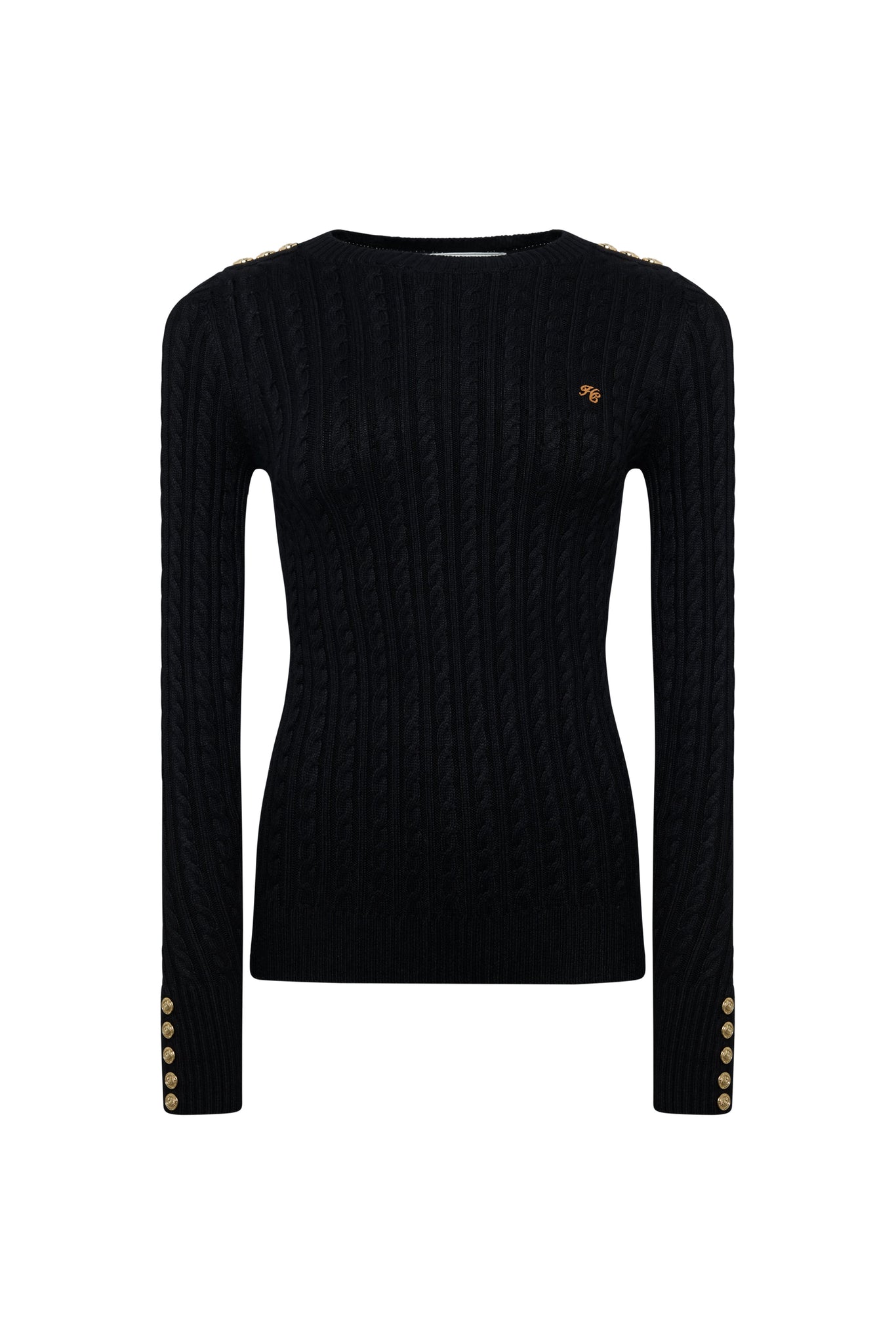 Designed with a slim fit with a classic and preppy aesthetic, this knit has been created to become an everyday essential in your wardrobe. Created with an elegant crew neck and long sleeves, this piece is intended to sit on the hip. Detailed with our signature gold rivets on the cuffs.