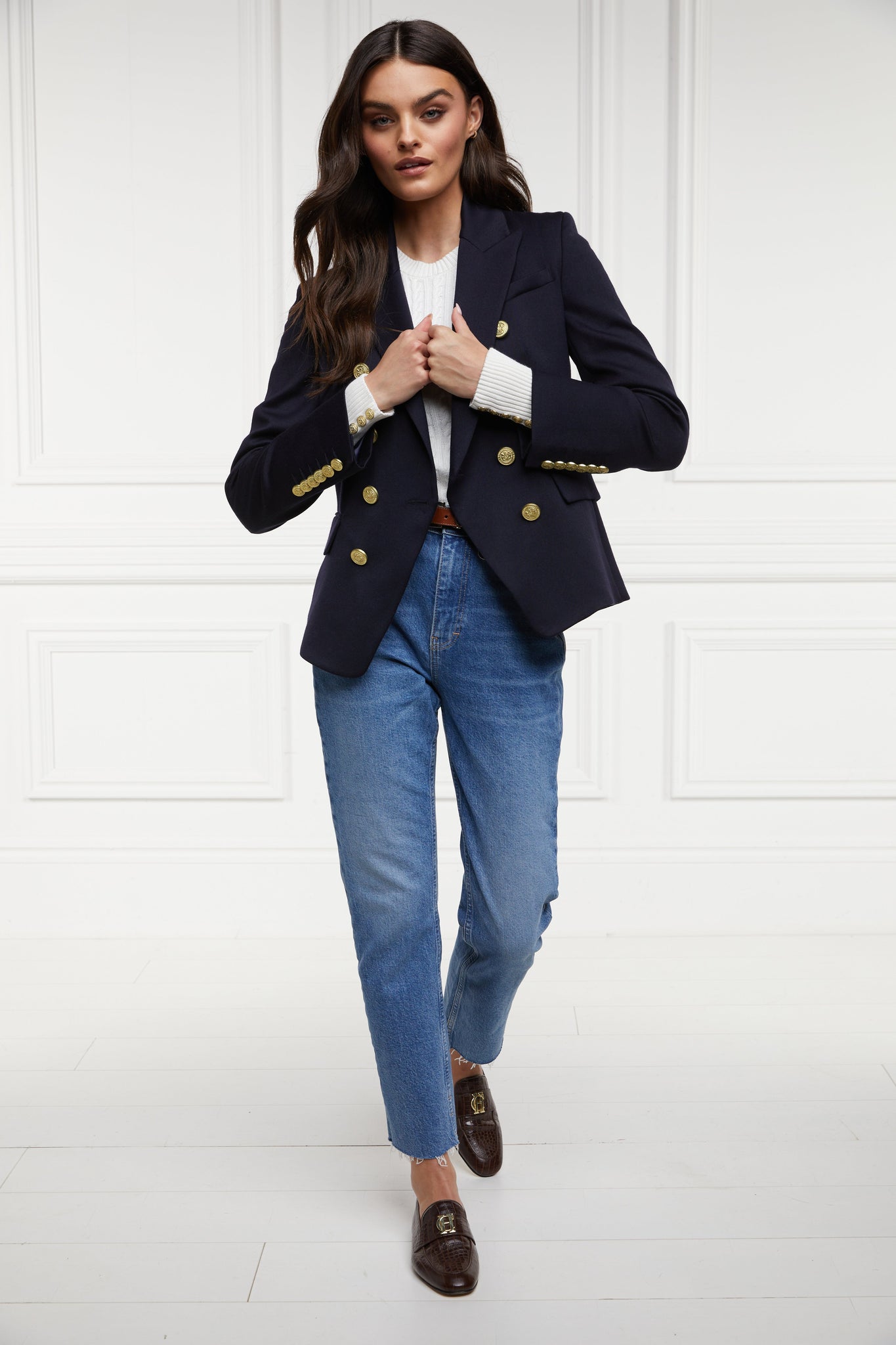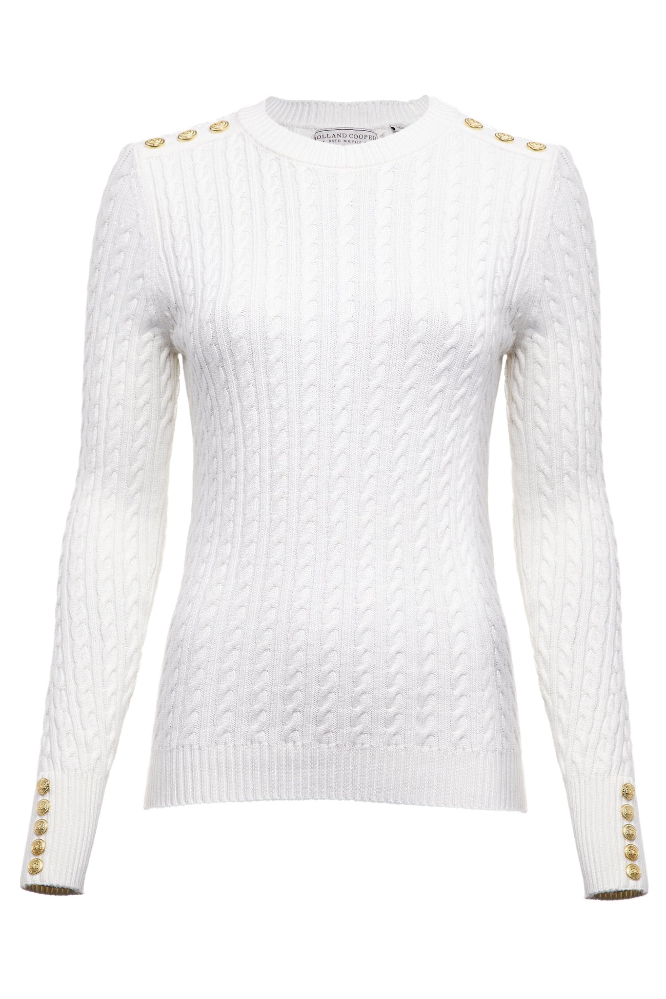 Designed with a slim fit with a classic and preppy aesthetic, this knit has been created to become an everyday essential in your wardrobe. Created with an elegant crew neck and long sleeves, this piece is intended to sit on the hip. Detailed with our signature gold rivets on the cuffs.