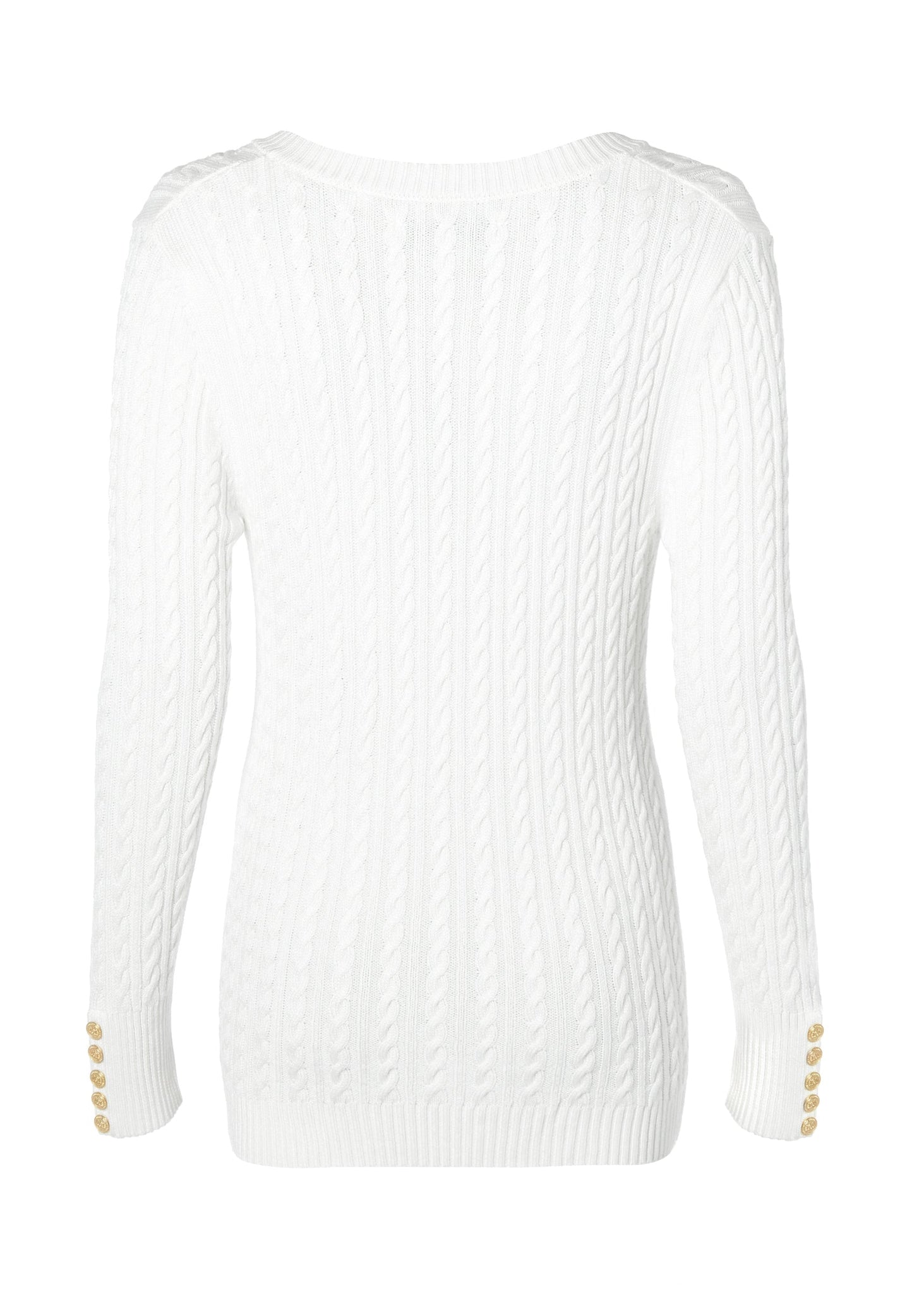 Designed with a slim fit with a classic and preppy aesthetic, this knit has been created to become an everyday essential in your wardrobe. Created with an elegant v-neckline and long sleeves, this piece is intended to sit on the hip. Detailed with our signature gold rivets on the cuffs.