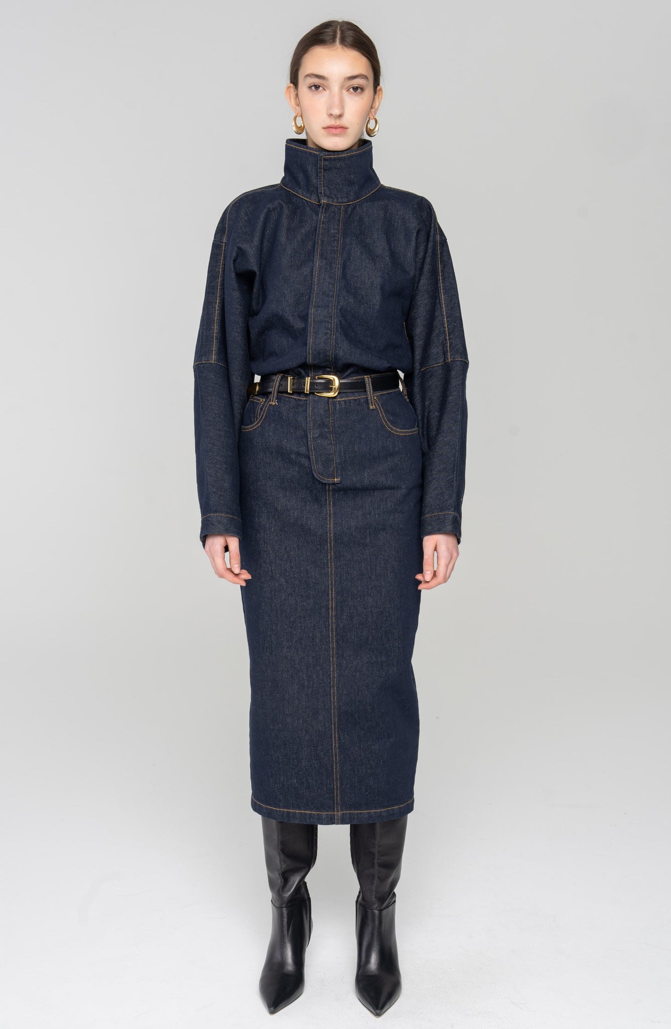 The Sebastian Dress is crafted in dark-wash denim with a high turtleneck, cinched waist, and zip-through front. A sharp, unexpected take on fall dressing—refined, edgy, and entirely modern.