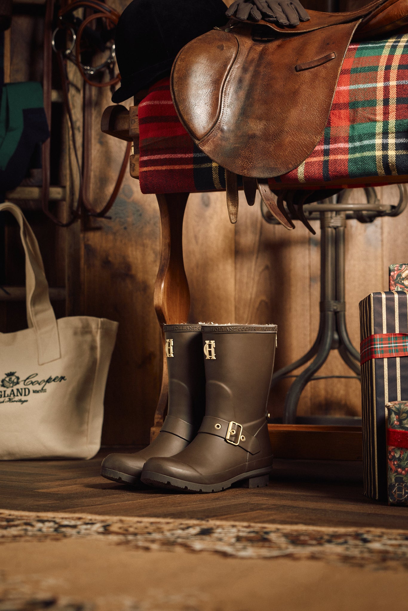 The superior full thermal sherpa lining is engineered to keep your feet and lower legs insulated, cosy and warm at all times. This eye-catching boot is adorned with iconic HC hardware and strapping details. Complete with side gusset allowing for an adjustable leg width ensuring our wellington boot fits across a range of calf sizes comfortably.