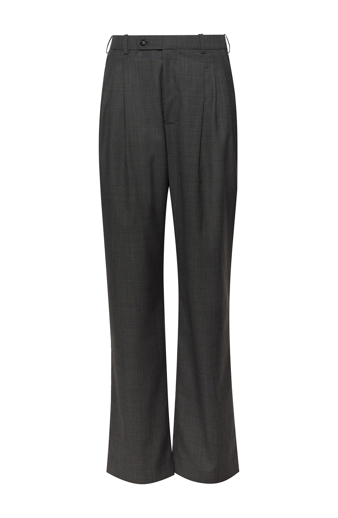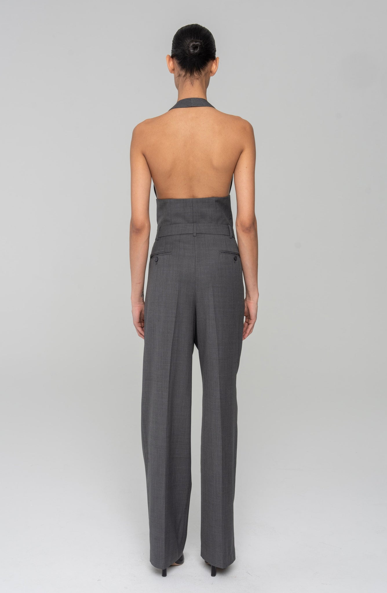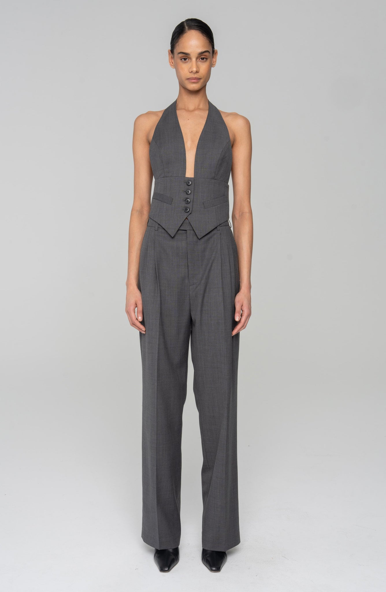 Cut with a fluid wide leg and tailored waistband, the Soprano Pant is a modern classic. Designed in a crisp dark grey suiting fabric, it elongates the silhouette and brings polish to every outfit. Wear it as a full look with the matching vest or blazer.