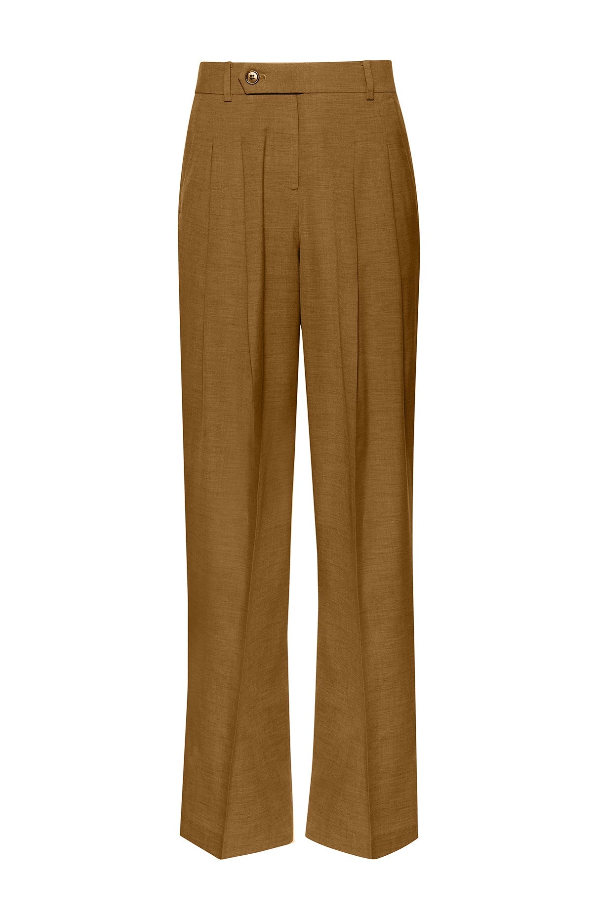 Cut with a fluid wide leg and tailored waistband, the Soprano Pant is a modern classic. Designed in a crisp camel suiting fabric, it elongates the silhouette and brings polish to every outfit. Wear it as a full look with the matching vest or blazer.