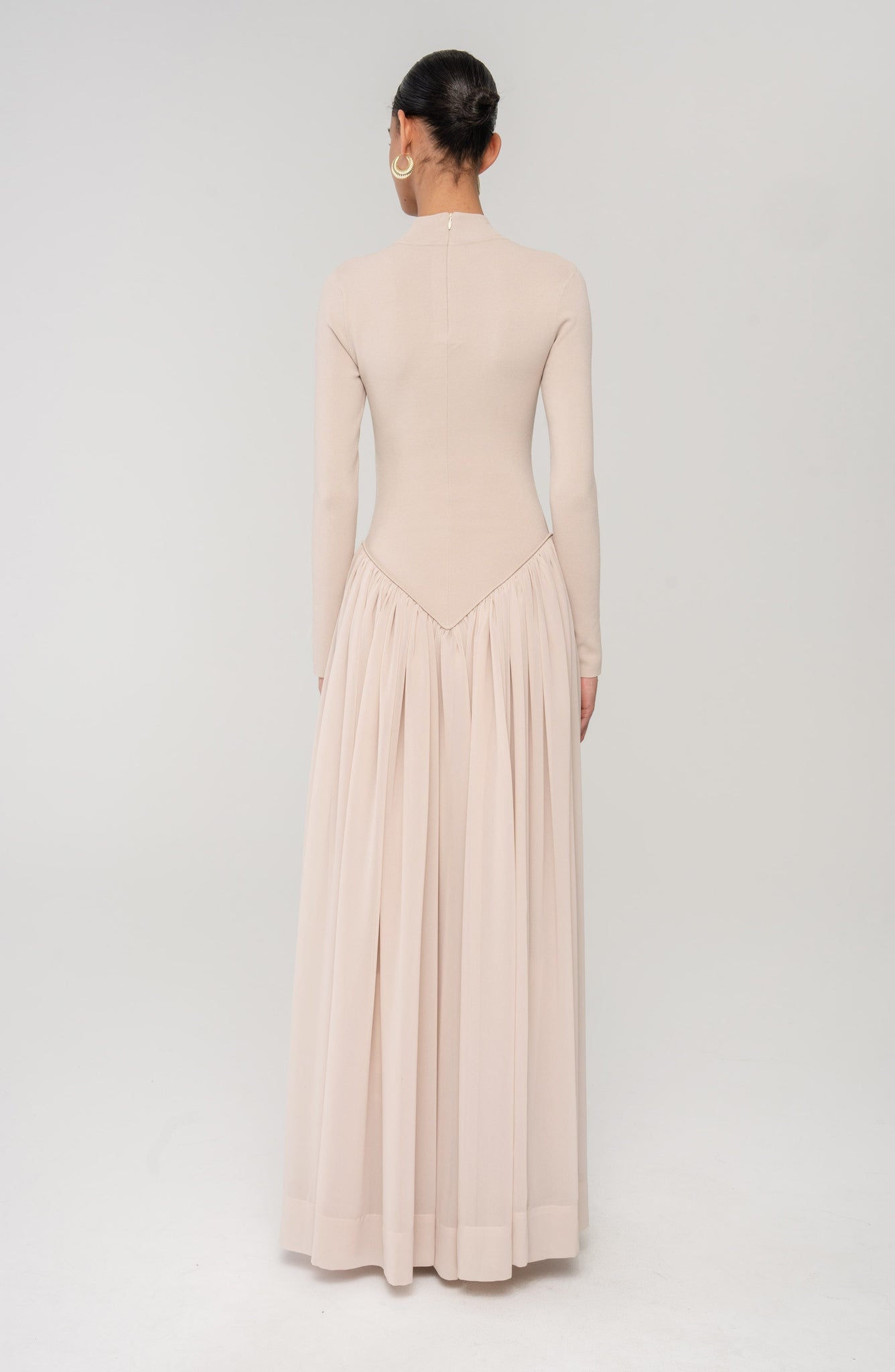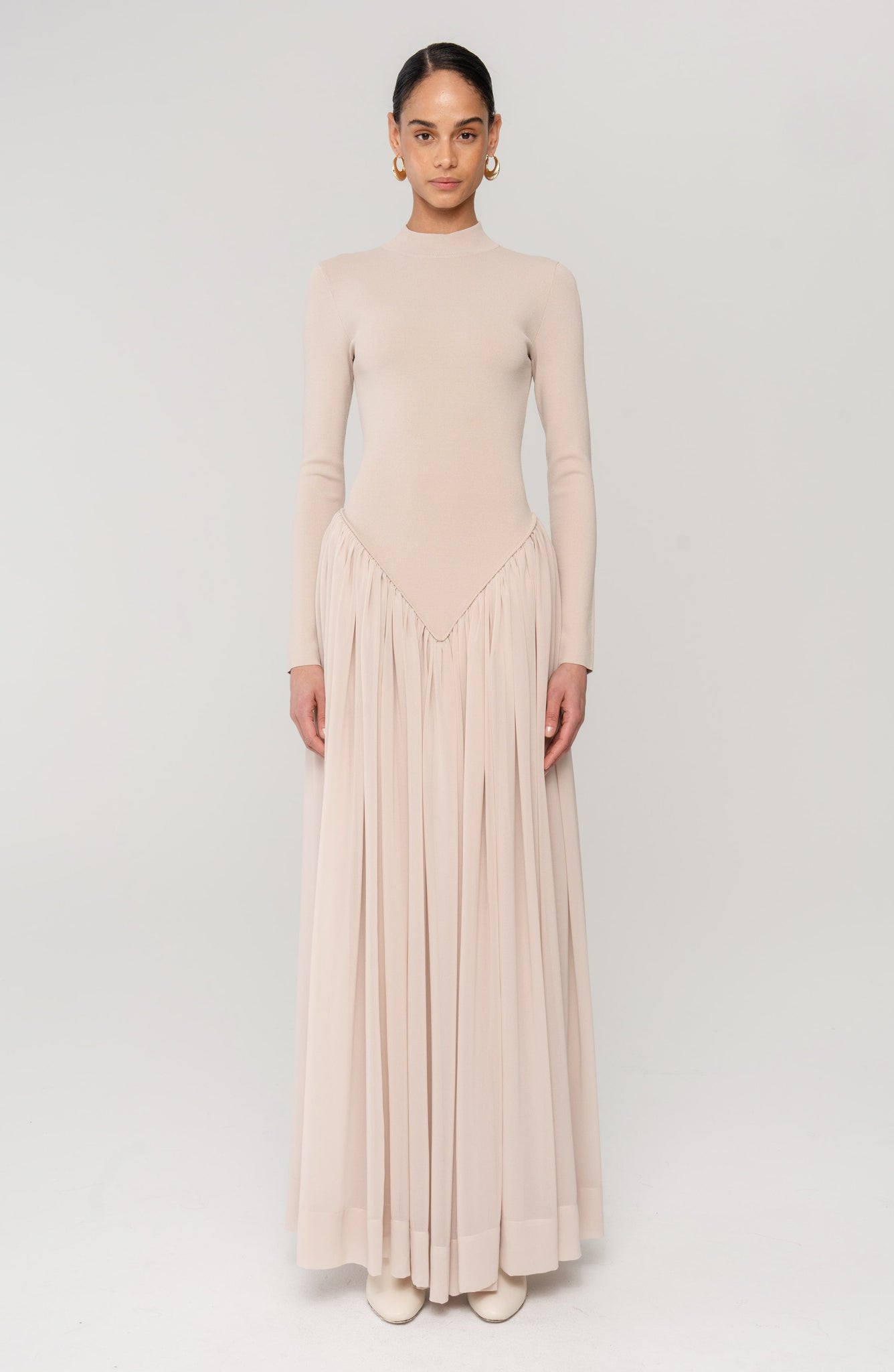 A sweeping silhouette that’s effortlessly refined. The Speck Knit Dress features a soft, ribbed bodice that melts into pleated jersey panels, offering playful movement with every step. Perfect for transitional weather or a city soirée.