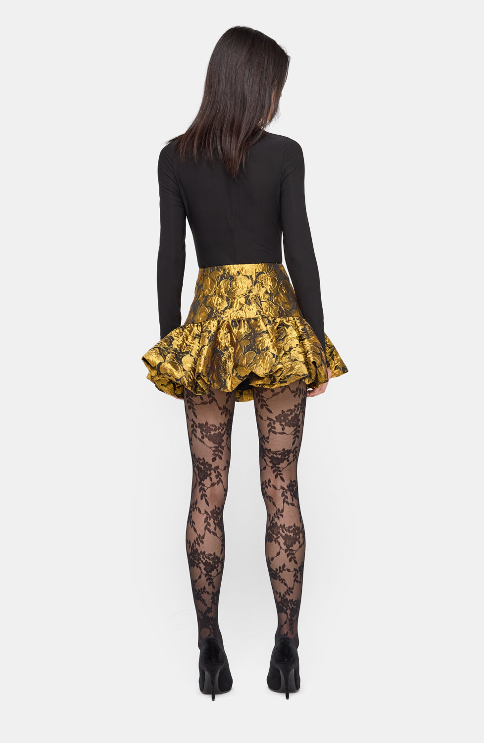 The Stormi Skirt is a bold mini crafted in gold floral brocade. Featuring a high waist and a flounced hem, it creates a sculptural silhouette that’s both playful and dramatic. Perfect for pairing with sleek tops or statement tights, it brings instant shine to any night-out look.