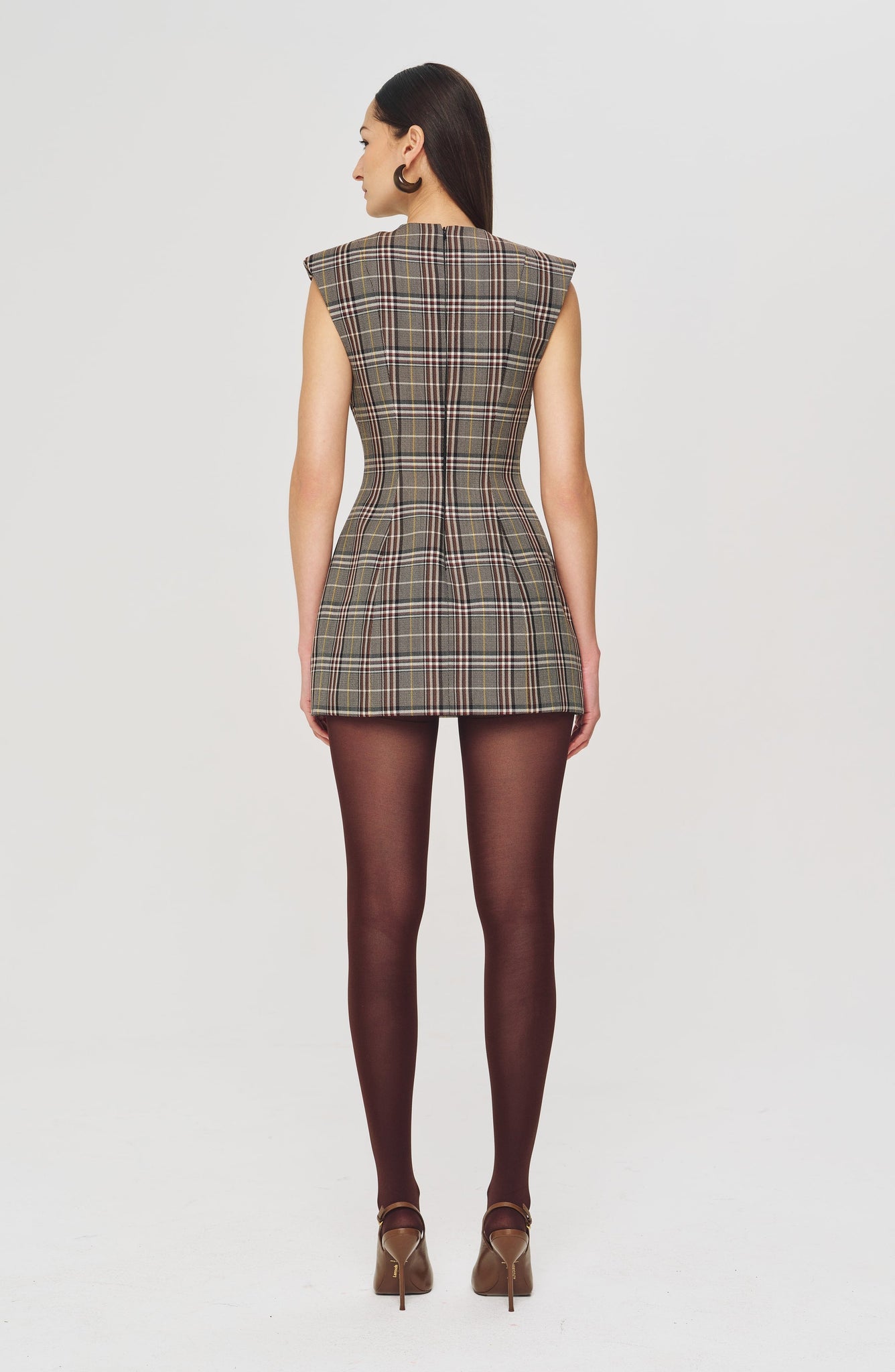 The Wolverton Dress is a standout in rich brown jacquard. The fit-and-flare silhouette is defined by a fitted bodice, strong shoulders, and a voluminous mini skirt. 6