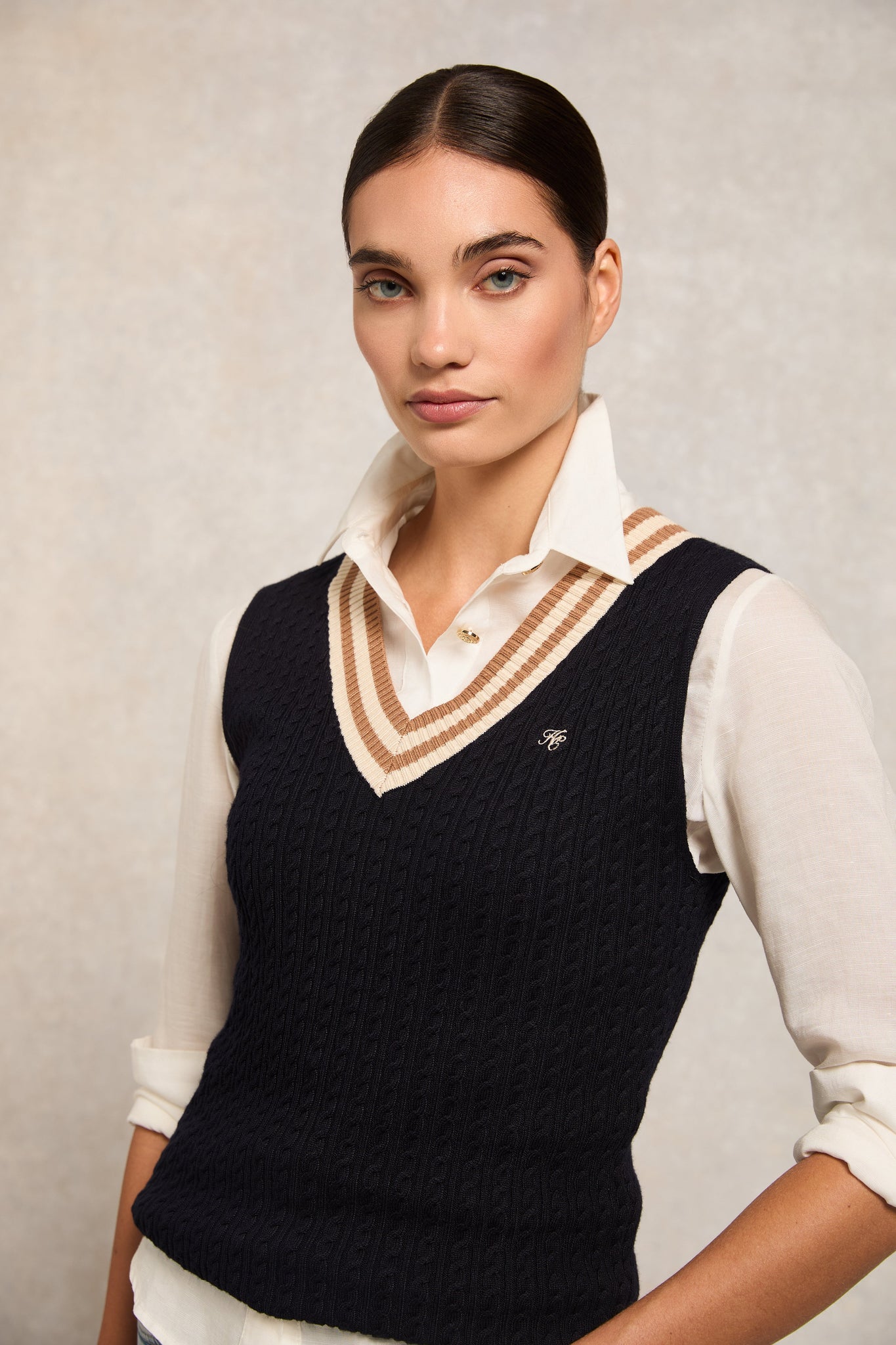 Crafted from a luxurious blend, this top offers a smooth, flattering fit that contours gracefully to the body. The design features a sophisticated play of textures with contrast rib stripes and intricate cabling throughout the body, adding a touch of classic charm. This slim-fit tank is an impeccable choice for both casual and elevated ensembles, promising versatility and style.