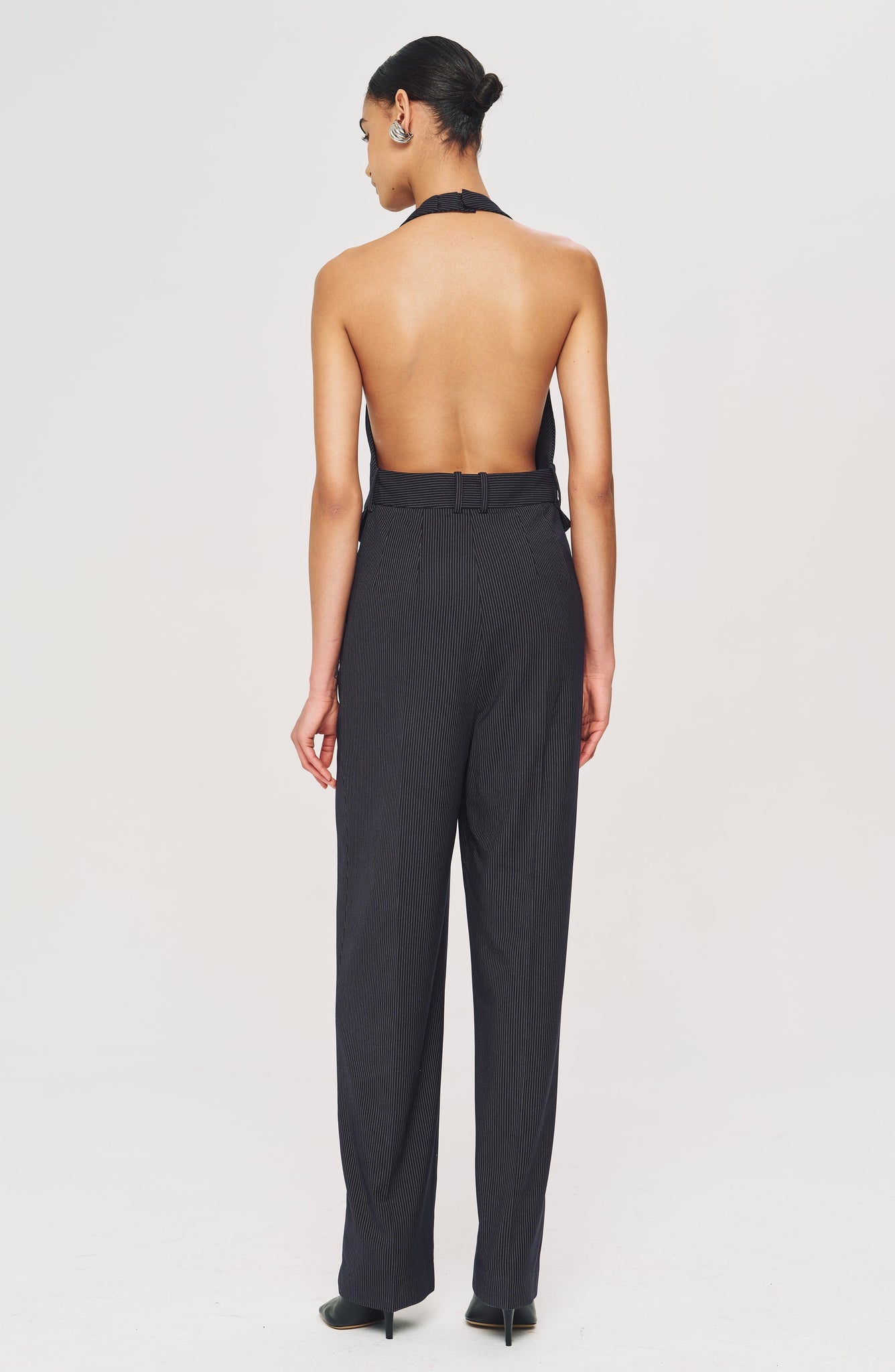 The Zuri Jumpsuit is cut from sleek pinstripe suiting with a deep V neckline and built-in vest detail that nods to classic menswear. The relaxed, wide-leg pant balances the fitted bodice—perfect for power-dressing with attitude.